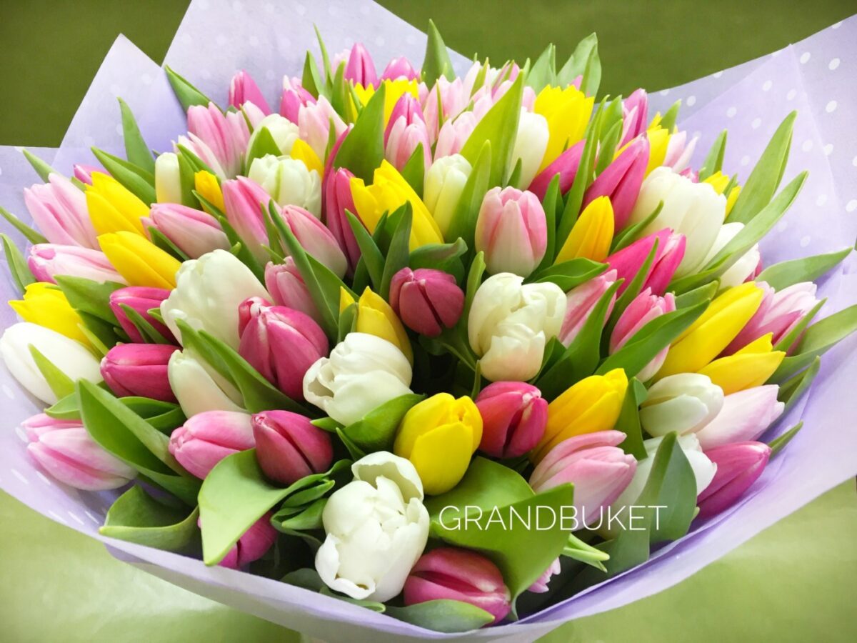 Букет тюльпанов в количестве 101 цветок, различных расцветок. Такой букет не заметь сложно, а радость от получения в подарок такого букета соответствовать количеству цветков.