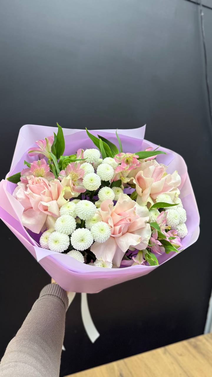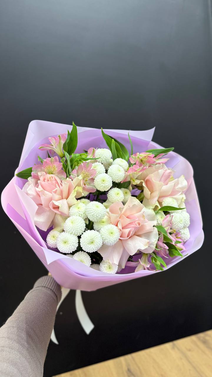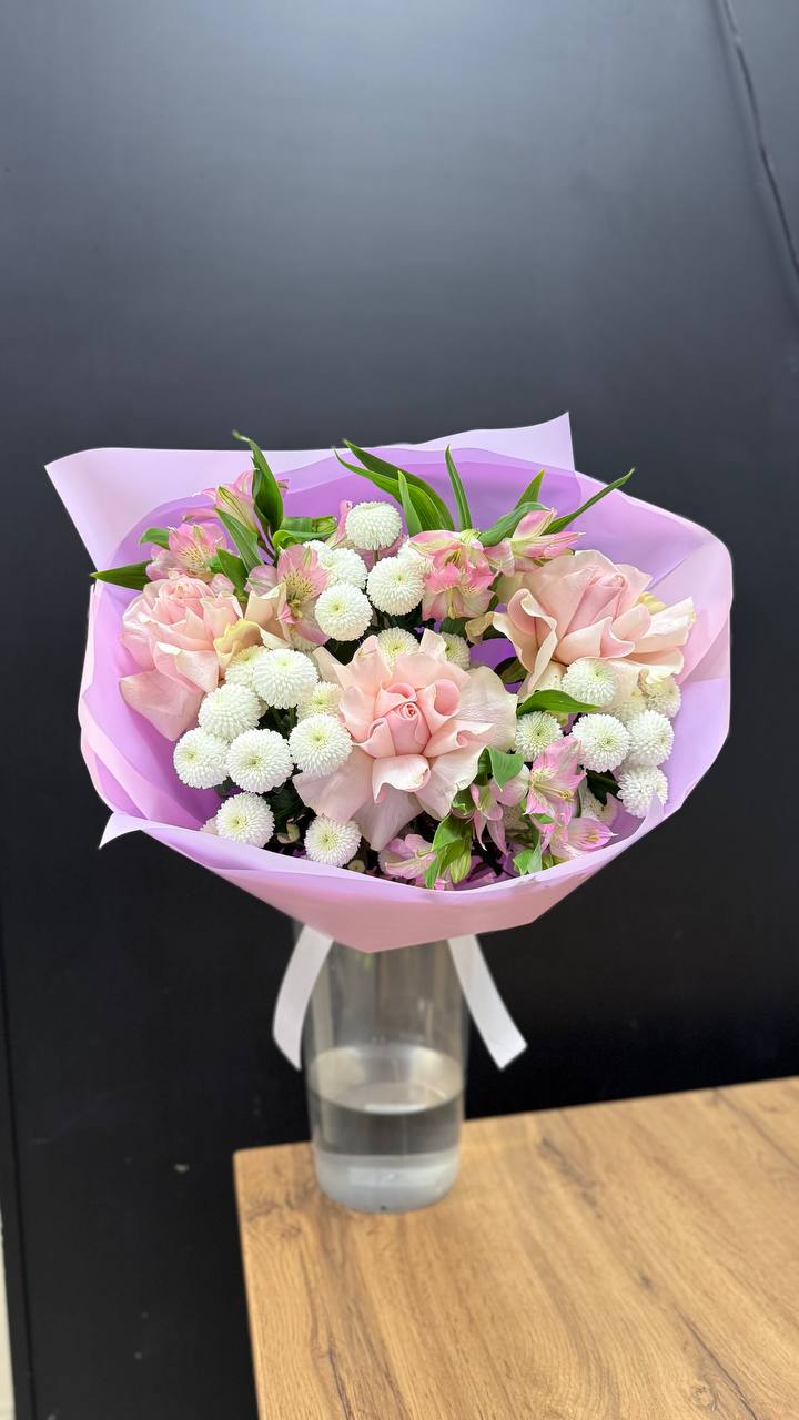 Хотите, чтобы ваш подарок вызвал возглас восторга с первой секунды? Этот красивый букет из французских розовых роз создан для моментальной влюблённости. В нём — всё, о чём мечтает романтичная душа: · Три слоя нежности: Роскошные розовые розы — символ восхищения. Пушистые хризантемы — знак долгой преданности. И изящные розовые альстромерии — пожелание удачи и процветания. Гармония формы и смысла. Элегантная сиреневая упаковка не просто дополняет, а возвышает букет, делая его законченным. Почему выбирают этот букет?