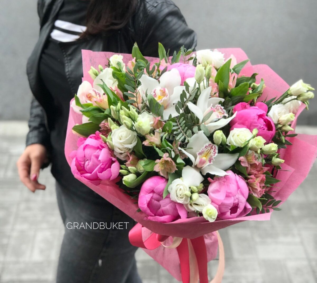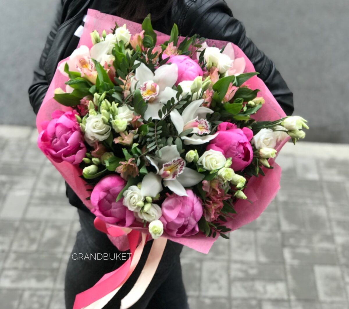 Сочный букет пионов, цикламенового цвета, с орхидеей. Такой букет подойдет на любой праздник, а необычное сочетание цветов надолго останется в памяти. Заказать цветы с доставкой вы можете в нашем магазине 24/7. Букет на день рождения или на свадьбу решать только вам- он универсален. У нас действует доставка цветов.