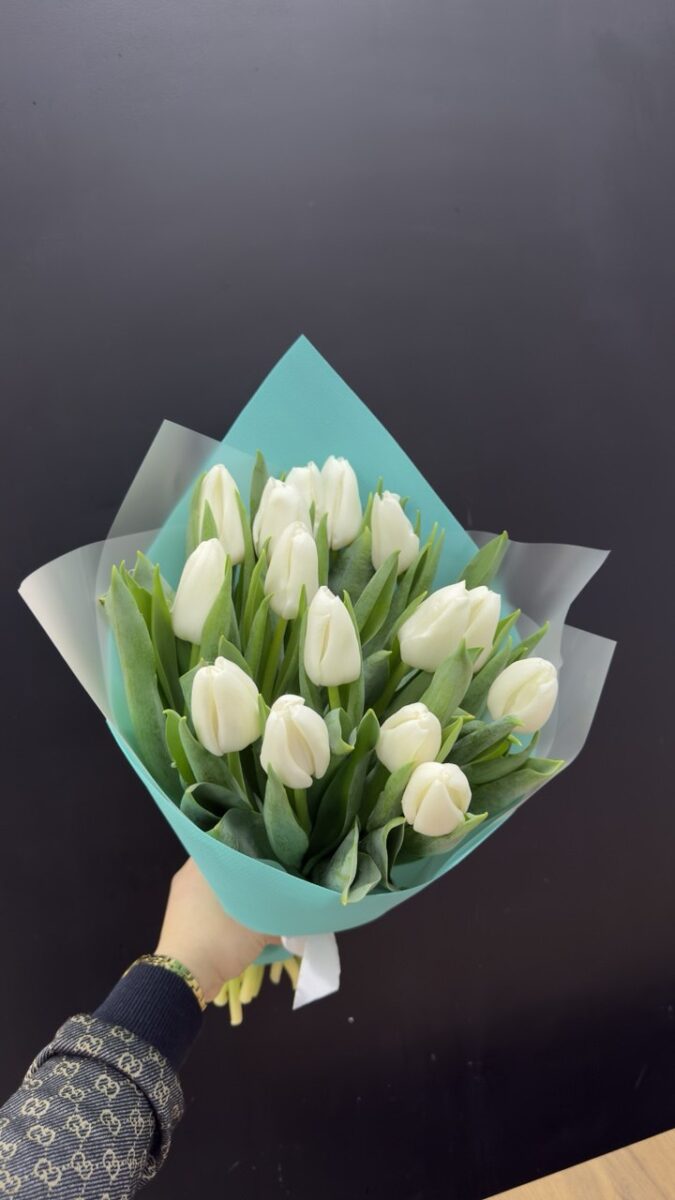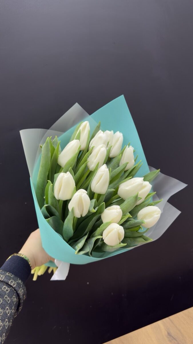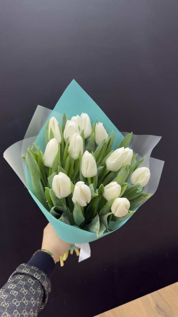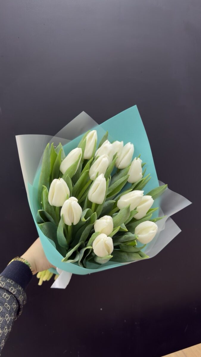 Мы отбираем только свежие цветы с закрытыми бутонами, которые простоят в вазе до 7 дней. В состав входит букет 25 белых тюльпанов высокого роста в стильной дизайнерской упаковке .