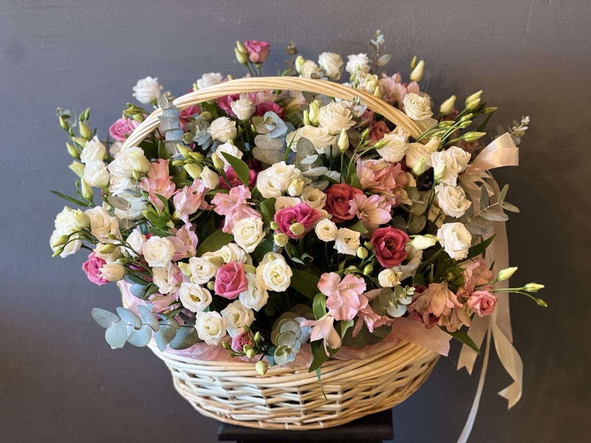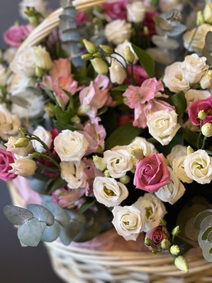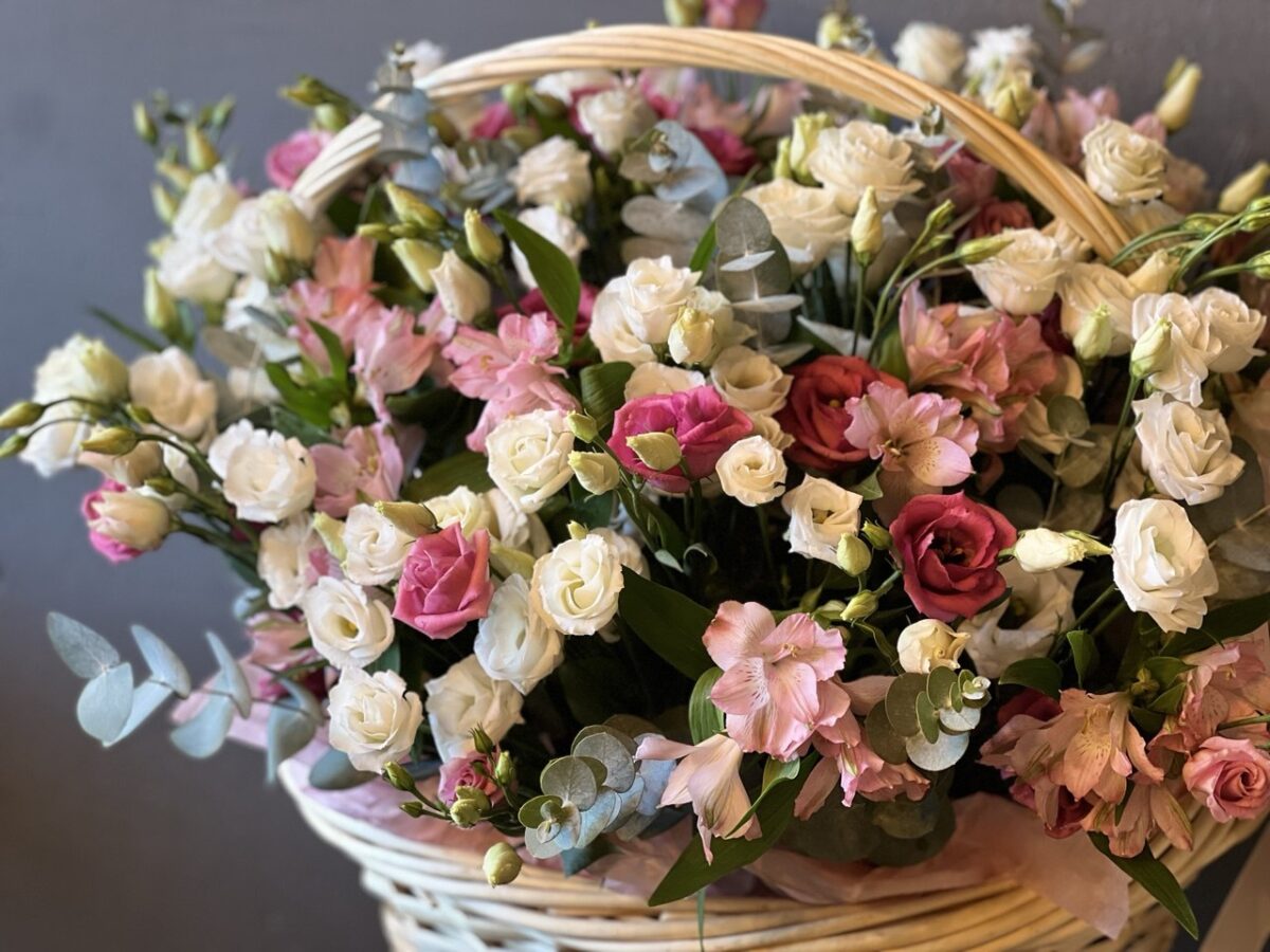 Воплощающая изящество и благородство природы. Эта большая корзина, наполненная обильным цветением альстромерии и эустомы в обрамлении серебристого эвкалипта, станет впечатляющим акцентом любого торжества или изысканным элементом декора вашего интерьера. Идеальное решение для тех, кто ценит масштаб, свежесть и утонченную эстетику.