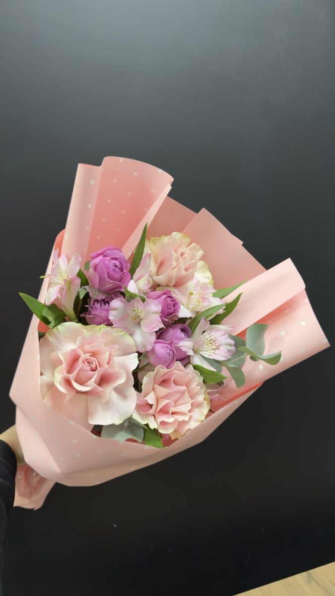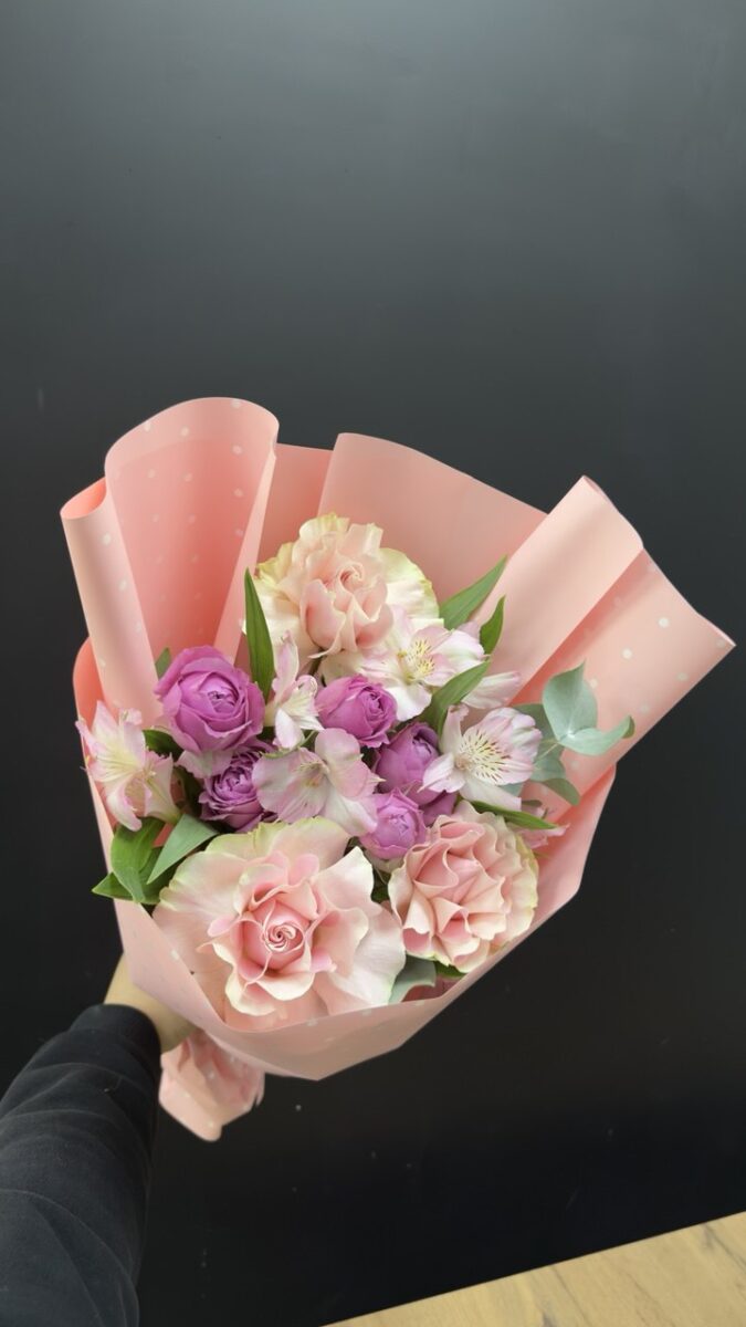 Розовые розы и кустовые розы с эвкалиптом