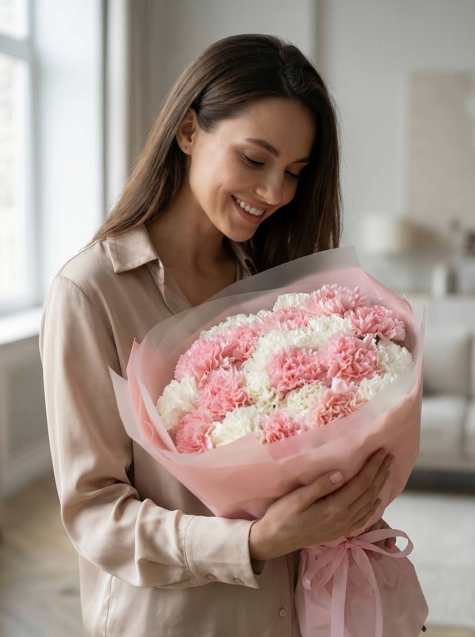 Подарите эту воздушную композицию из розовых и белых гвоздик.