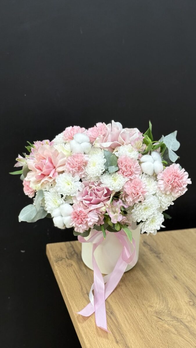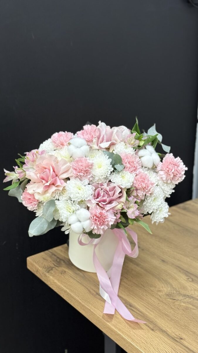 Долговечность: Благодаря флористической губке внутри, композиция будет радовать свежестью дольше, чем обычный букет в вазе.