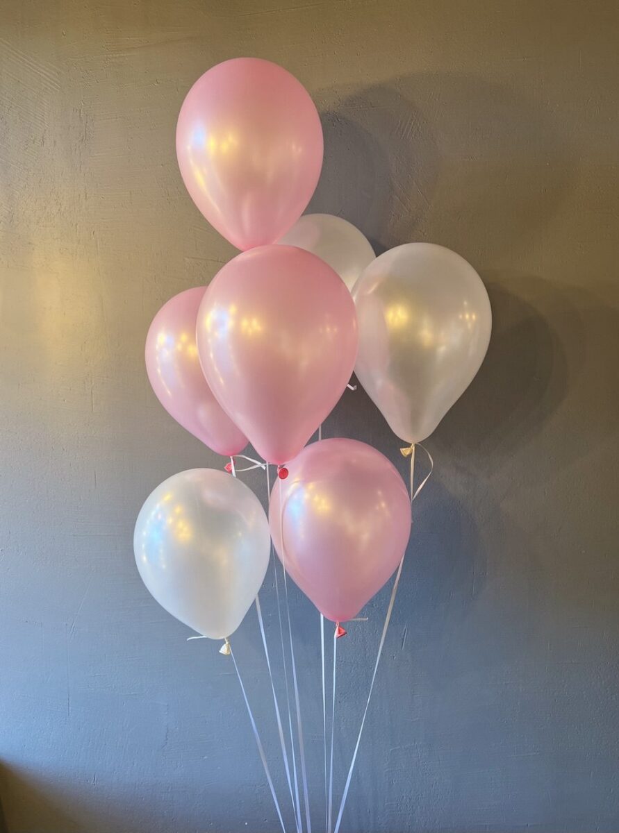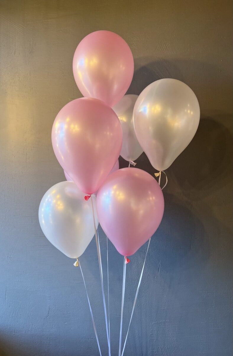 Комплектация: 7 латексных воздушные шары (розовые и белые в ассортименте), наполненных гелием, ленты для крепления.